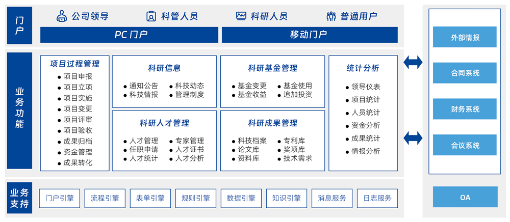 企业科研一体化管理平台,,涵盖科研项目全生命周期管理,,,,能够对科研信息、、科研基金信息、、、科研人才、、、、科研成果全方位管理,,并实现统计分析。。。可宏观把控项目资金、、、、资源分配;可实时查看科研项目核心业务数据报告并进行深度分析;可实时监控各个项目动态。。。。