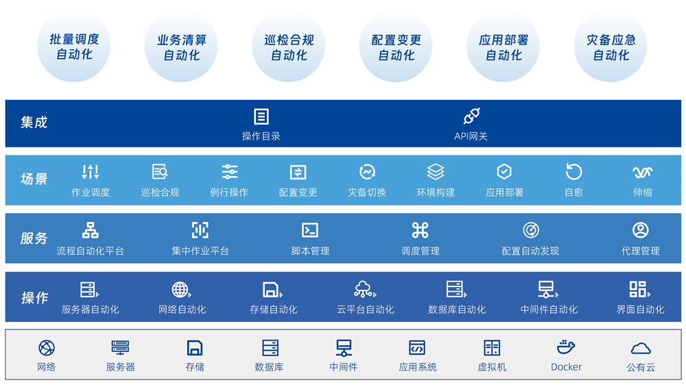 提供组织级全流程自动化运维,,,可以把企业最佳的运维流程固化为模板,,,实现对任意数量 IT 资源的批量标准化执行,,,完成配置变更、、、数据收集、、、、环境构建、、故障自愈、、、、资源调整、、应用部署、、、自动巡检等场景的自动化,,,显著提升日常运维工作的效率和可靠性,,缩短操作时间、、、、降低运维操作的成本和操作风险。。。
