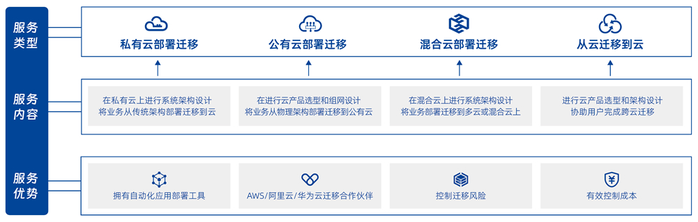 提供业务上云及云间迁移的端到端服务,,,,评估业务系统现状,,,,规划设计迁移架构、、迁移技术和迁移方案,,,应用及数据上云迁移实施,,,云上系统部署,,,云上数据及业务验证,,迁移后运维保障及持续优化服务。。