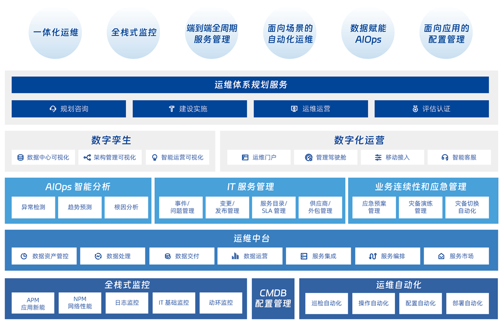 针对数字化时代对运维管理的需求,,,自主研发的“监管控析”一体化智能运维解决方案。。。。平台以客户和业务场景为导向,,,,通过全业务的数据和流程整合,,,同时支持传统 IT 架构和云技术架构的“双态 IT”运维,,实现可视化、、、、场景化、、、自动化、、、精细化的智能运营管理,,,,提升用户体验及运营效率,,,,助力内外部生态的数字协同和价值创造。。